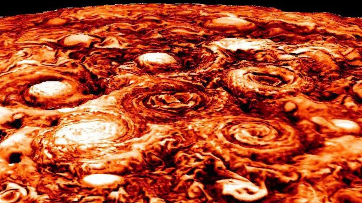 नासाच्या जुनो मिशनने ज्युपिटरच्या नॉर्थ जोव्हियन पोल येथे चक्रीवादळांचे एक जग शोधले आहे. चक्रीवादळ एका प्रक्रियेद्वारे खांबावर वाहते, संशोधकांना जुनोकॅम आणि जोव्हियन इन्फ्रारेड अरोरा मॅपर मार्गे “बीटा ड्राफ्ट” म्हणून संबोधले जाते. चक्रीवादळ त्यांच्या केंद्रांभोवती दोलायमान करतात आणि खांबाच्या सभोवताल घड्याळाच्या दिशेने जाऊ शकतात. जूनो आयओच्या सर्वात आतल्या जोव्हियन मूनच्या आवर्ती फ्लायबीस बनवित आहे, ज्यामुळे भूमिगत मॅग्मा त्याच्या पृष्ठभागाच्या खाली वाहते याचा पुरावा उघडकीस आणत आहे. हे शीतकरण प्रवाह हे स्पष्ट करू शकतात की आयओचे ज्वालामुखी कसे फुटतात, कारण चंद्राच्या सुमारे 10% उपनगरामध्ये हे प्रवाह आहेत.