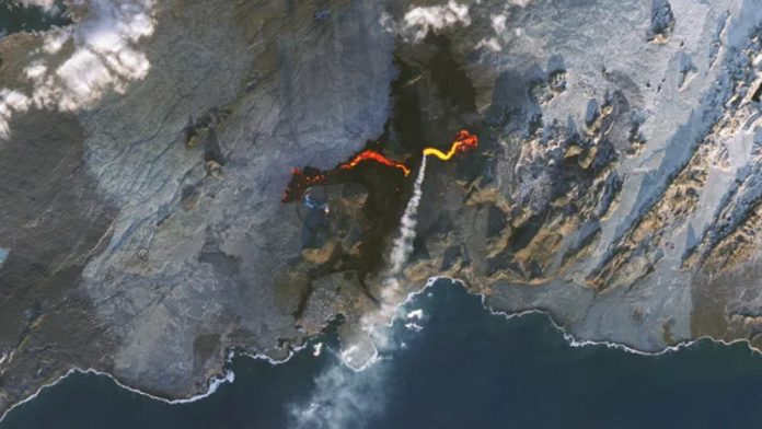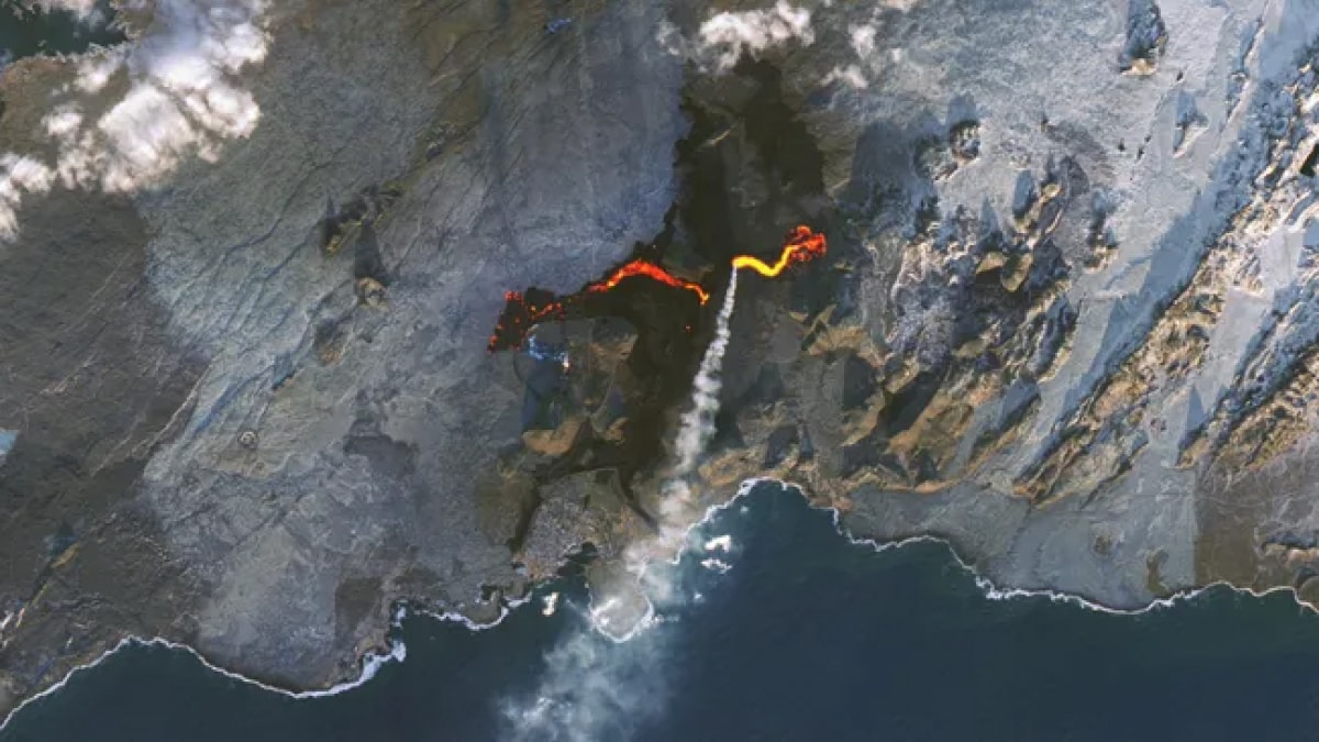 आइसलँडच्या ब्लू लॅगूनजवळ सक्रिय विदारकातून लाव्हाचा नाट्यमय प्रवाह नासाच्या उपग्रहांनी पकडला होता, ज्याने रेकजेन्स द्वीपकल्पावर चालू असलेल्या ज्वालामुखीच्या क्रियाकलापांवर प्रकाश टाकला होता. लँडसॅट 9 आणि सुओमी एनपीपी उपग्रहांनी घेतलेल्या प्रतिमा, 27 नोव्हेंबर रोजी सोडण्यात आल्या, ज्या 20 नोव्हेंबरपासून सुरू झालेल्या उद्रेकाची तीव्रता दर्शवितात. इन्फ्रारेड व्हिज्युअल्सपासून 47 किलोमीटर अंतरावर असलेल्या आइसलँडची राजधानी असलेल्या रेकजाविकच्या तुलनेत लावाची चमक दिसून येते. साइट.