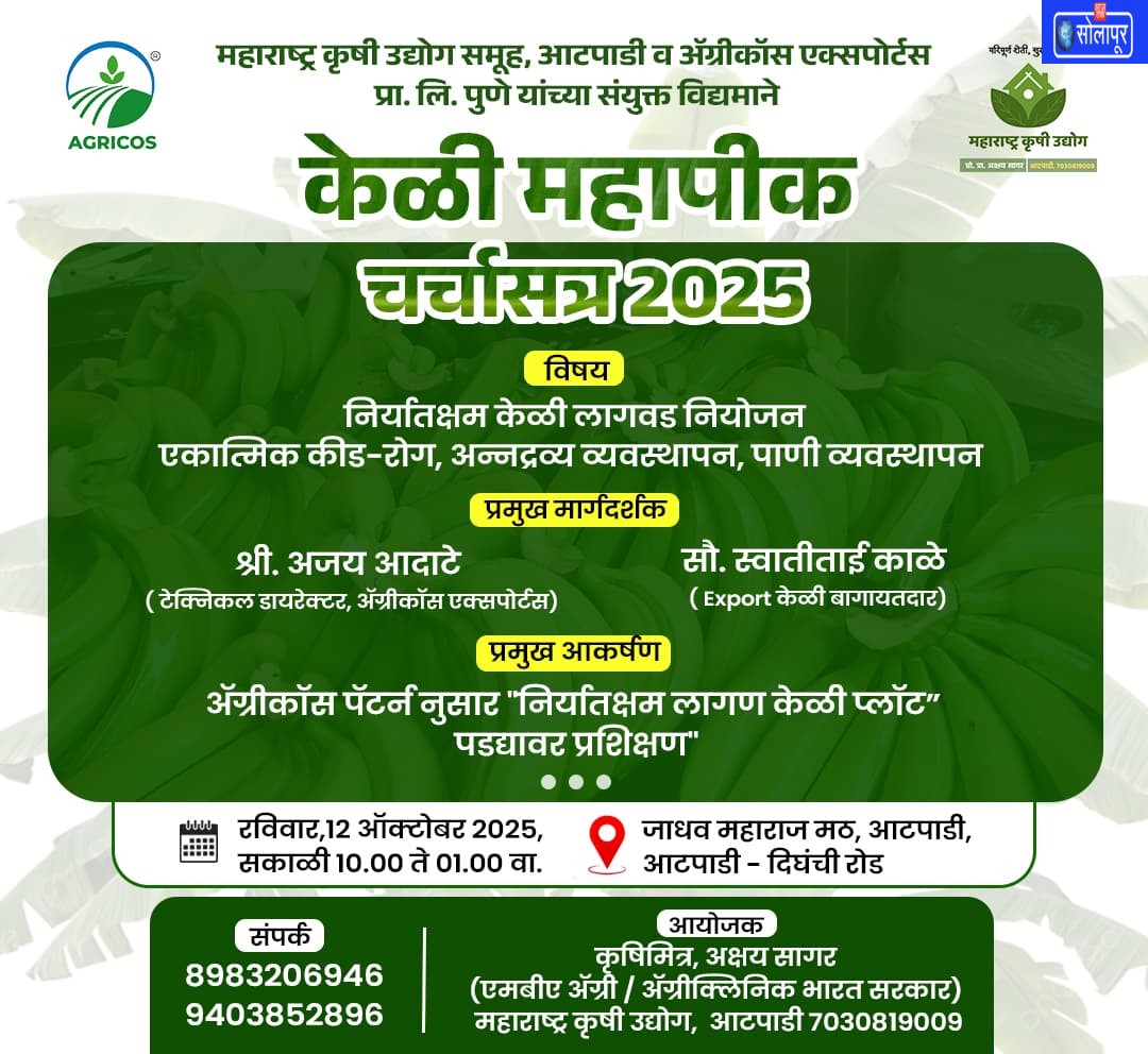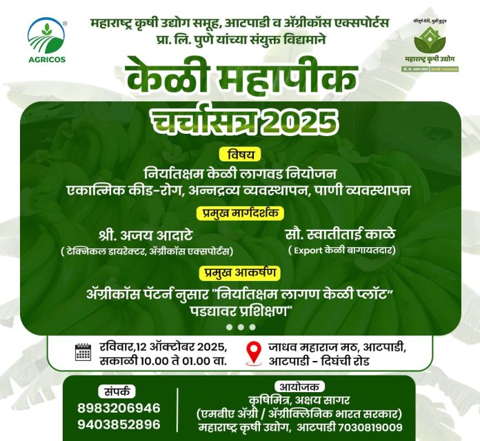 या चर्चासत्राचे आयोजन कृषिमित्र अक्षय सागर (महाराष्ट्र कृषी उद्योग समूह, आटपाडी) यांच्या वतीने करण्यात आले असून, कृषिमित्र अजय आदाटे हे ‘केळी निर्यात तंत्रज्ञान’ या विषयावर शेतकऱ्यांना मार्गदर्शन करणार आहेत.उत्पादनात वाढ, खर्चात बचत आणि केळीचे निर्यातक्षम उत्पादन याबाबत उपयुक्त माहिती मिळविण्यासाठी परिसरातील सर्व केळी बागायतदार शेतकऱ्यांनी या कार्यक्रमास उपस्थित राहावे, असे आवाहन आयोजकांनी केले आहे.