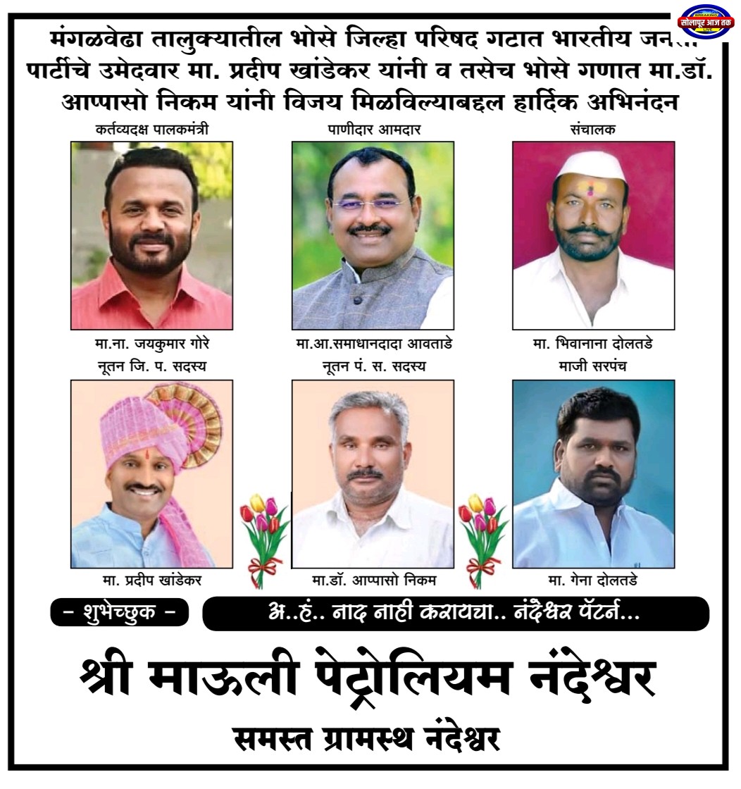 नंदेश्वर/ प्रतिनिधी : मंगळवेढा तालुक्यात सर्वाधिक लक्षवेधक आणि हायव्होल्टेज ठरलेल्या भोसे जिल्हा परिषद गटाच्या निवडणुकीत अखेर भाजपचे उमेदवार प्रदीप खांडेकर यांनी मोठे मताधिक्य मिळवित विजय मिळविला आहे. प्रदीप खांडेकर यांचा विजय हा आगामी राजकीय घडामोडींसाठी महत्त्वपूर्ण ठरणार असल्याच्या चर्चा सध्या मंगळवेढा तालुक्यात होत आहेत. प्रदीप खांडेकर यांच्या विजयात नंदेश्वर गावाचा सिंहाचा वाटा असल्याचे बाब निकालाच्या आकडेवारीवरून स्पष्ट होत आहे.