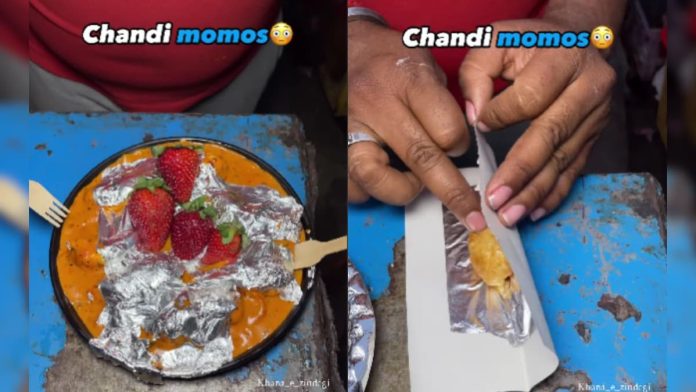 त्यानंतर, विक्रेता पॅनमध्ये एक संस्काराचे प्रमाण ओततो, त्यानंतर मसाळाचा एक गंध, एक चिमूटभर मीठ आणि टोमॅटो केचअप. तो माणूस नंतर तेलाने भरलेल्या पॅनमध्ये मोमोजला तळतो. त्याने तळलेले डंपलिंग्ज अॅल्युमिनियम फॉइलमध्ये गुंडाळले आणि त्यांना ट्रेमध्ये ठेवते. वेगळ्या प्लेटवर, तो ग्रेव्हीला अगदी पसरवितो आणि त्यात अॅल्युमिनियम-लपेटलेल्या मोमोजमध्ये जोडतो. ग्रेव्ही आणि खाद्यतेल चांदीचा आणखी एक थर जोडला आहे. विक्रेता पुढे काय करते हे सर्वात मनोरंजक गोष्ट आहे. तो वर चार स्ट्रॉबेरीसह मोमोसची सेवा करतो. व्होइला! चंडी मोमोस तयार आहेत. “तुम्ही या मोमोजचा कधी प्रयत्न केला आहे का?” साइड नोट वाचा.